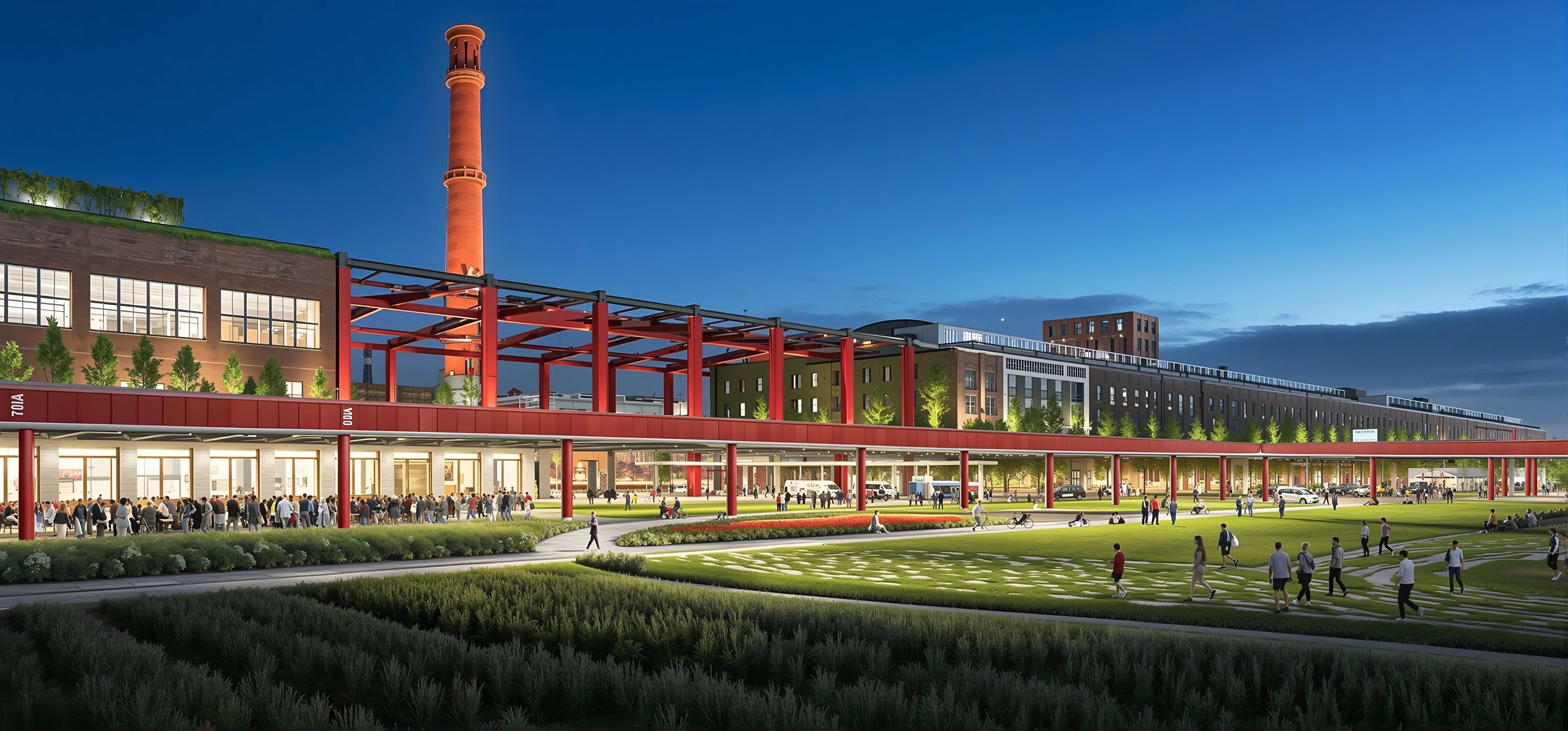 方案聚焦“四廠房一煙囪”核心巨構:4棟300米長連續廠房(保留東側2棟文保建筑原貌+西側2棟改造建筑)與100米煙囪形成震撼天際線。帕提農神廟式空間體驗:廠房內部高聳的混凝土柱列形成神圣的序列感,為展覽、秀場提供史詩級空間載體。地下保留煉鋁結構樁基,轉化為下沉式咖啡餐飲空間,裸露工業構件強化歷史痕跡。設計以“自然生長的工業場所”為隱喻,在呵護華鋁歷史基因的同時,植入現代藝文血脈,使廢棄廠區蛻變為集工業旅游、時尚發布、市民休閑于一體的“蘭溪新磁場”,踐行“老樹發新芽”的再生哲學。